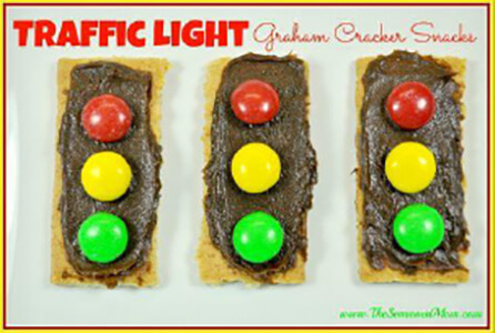Parents can allow their children to help make traffic light snacks. Children can spread chocolate on a graham cracker and use M&Ms for thr lights.